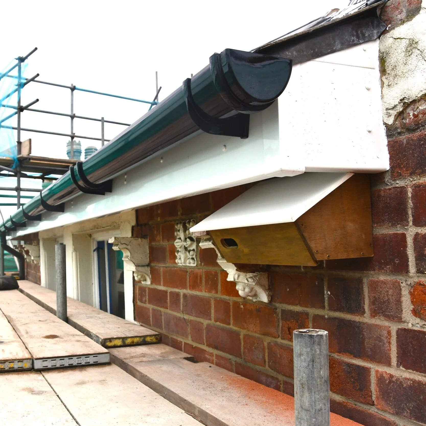 In the height of summer, the corner aspect of the walls will both receive at least two hours of low sun, so we had two special boxes with extra insulation made, this was just a precautionary measure against temperatures in the box getting too high, chicks can be very susceptible to dehydration. Climbing the scaffolding to guttering level our first job, after admiring the views, was to locate the exact sight of the old nests, a sure sign being slight streaks of guano on the wall below the entrance, these locations we found conveniently positioned with an architectural symmetry, one to each side of the top corner facing window. Taking our time in order to be sympathetic to the nature of the old brick work of the building, we prepared the boxes, then with a lot of measuring and a little drilling they were up, and looking pretty smart we must say, let's keep our fingers crossed that the swifts think so too.